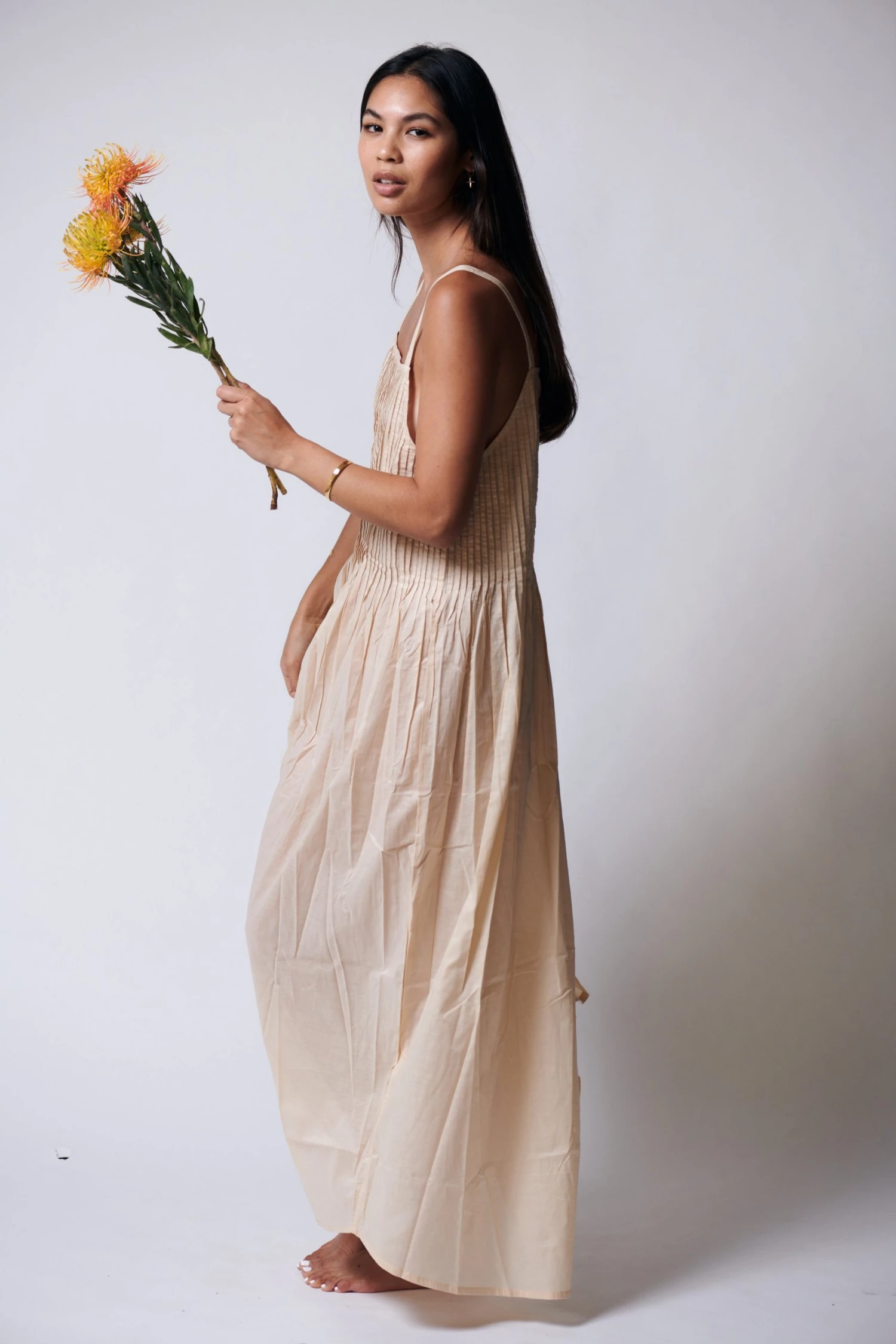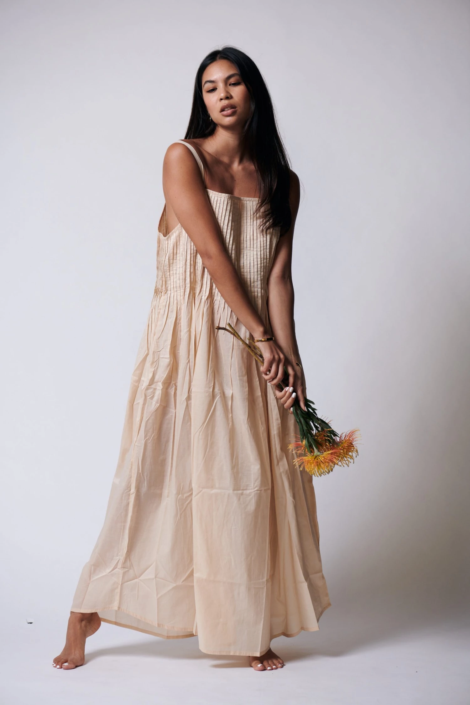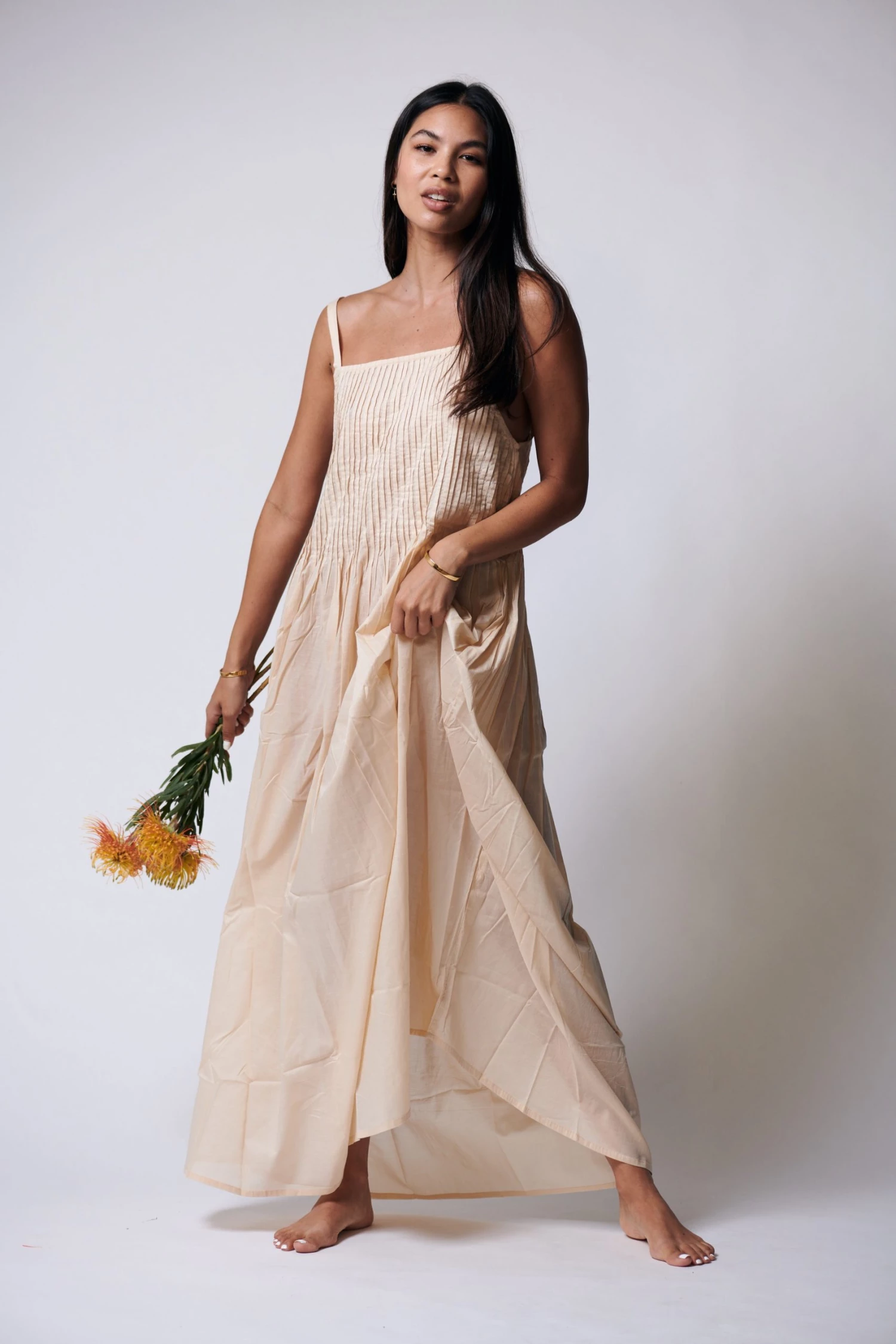 The Acacia Swimwear Kyoto Dress in Oat is a maxi dress with shirred bust fabric and a flowing, easy fit for days under the sun.Â