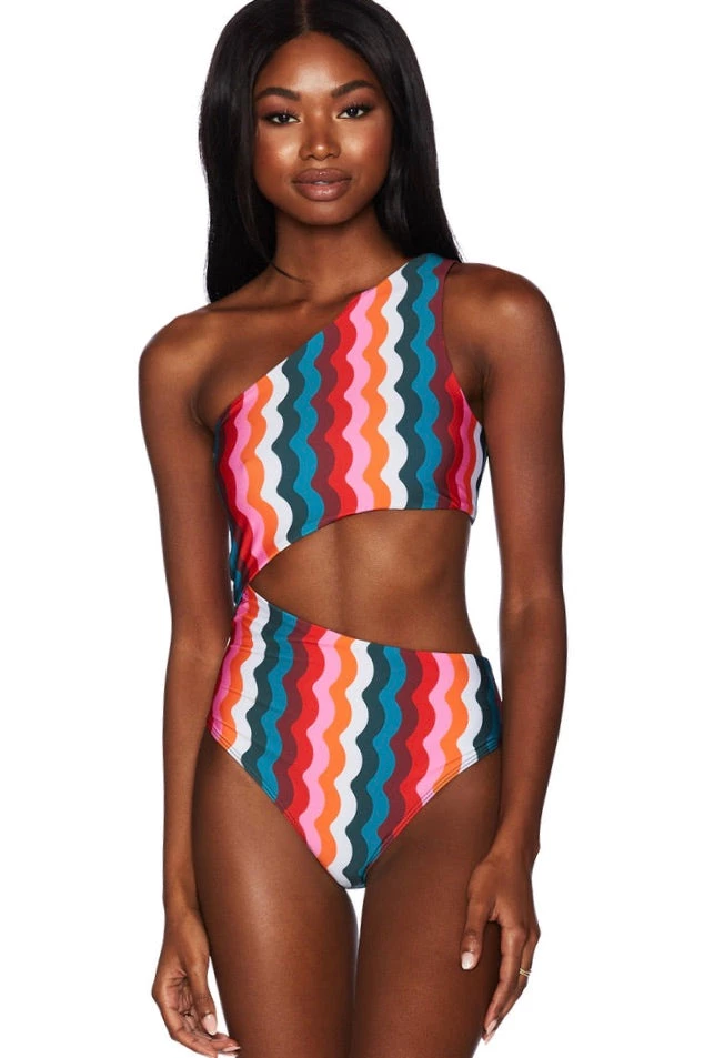 A crowd favorite, the Celine is an asymmetrical printed one piece swimsuit with side cutouts and moderate coverage. Chic and new, she has become one of our bestsellers. Perfect for any activity, from lounging poolside to swimming in the ocean.