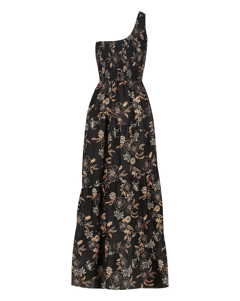 The gorgeous floral print and vintage-inspired shirring in this one-shoulder maxi make for a stunning combination. Wear it with chunky heels for an evening soiree.