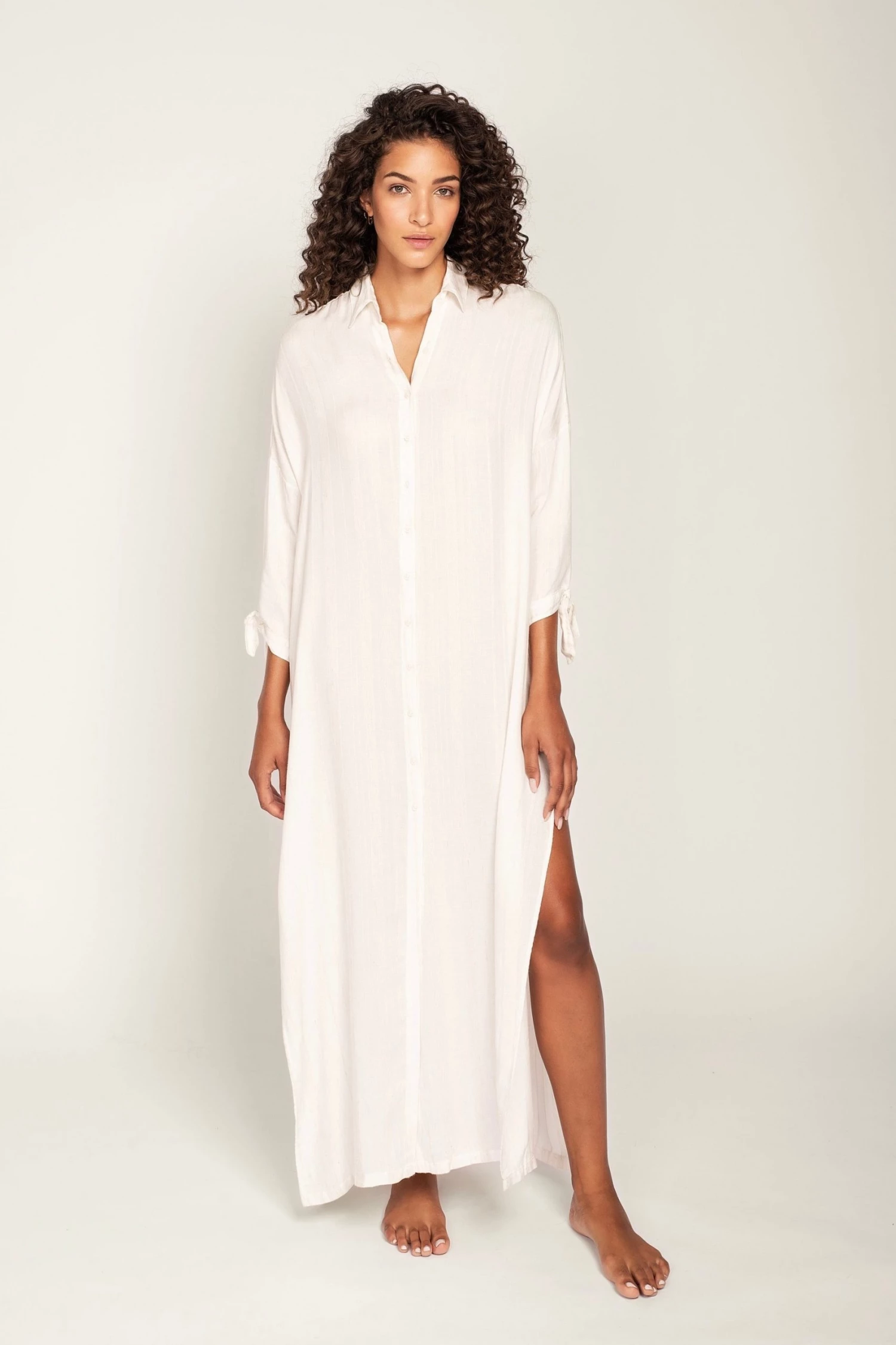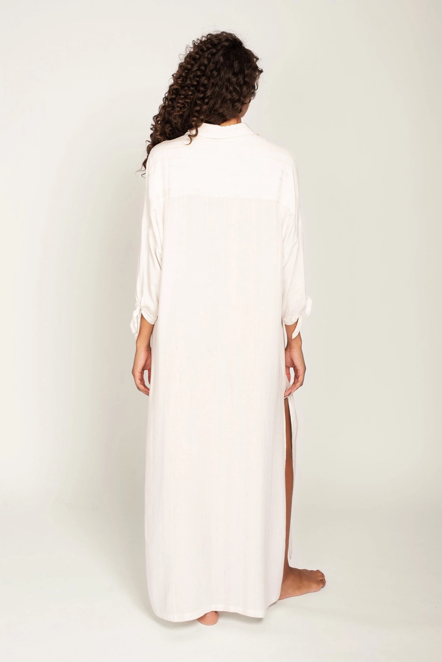 Button up long dress in a beige canvas stripe. 3/4 sleeves. Ribbon tie cuff. Side slits detail. 100% cotton.