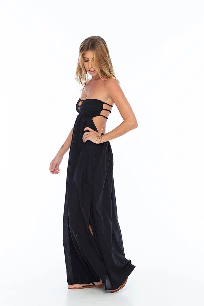 This maxi dress from Indah features a bandeau style top with a low back, and slits on the side of the dress.
