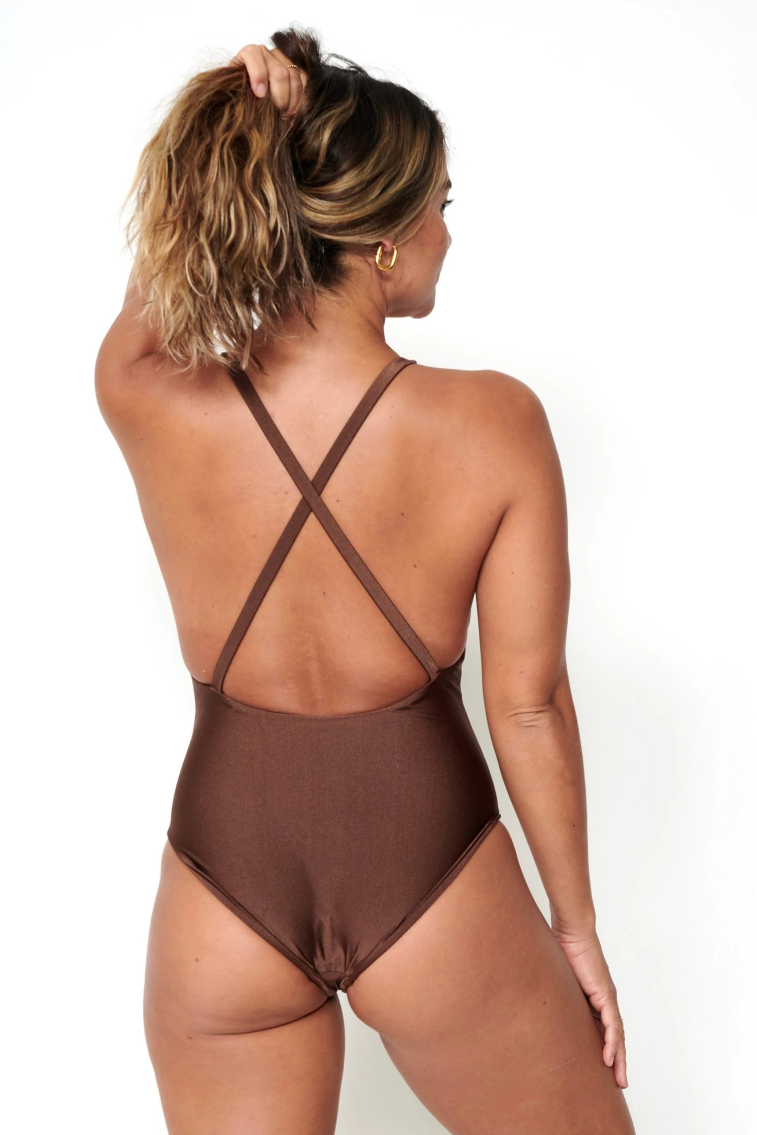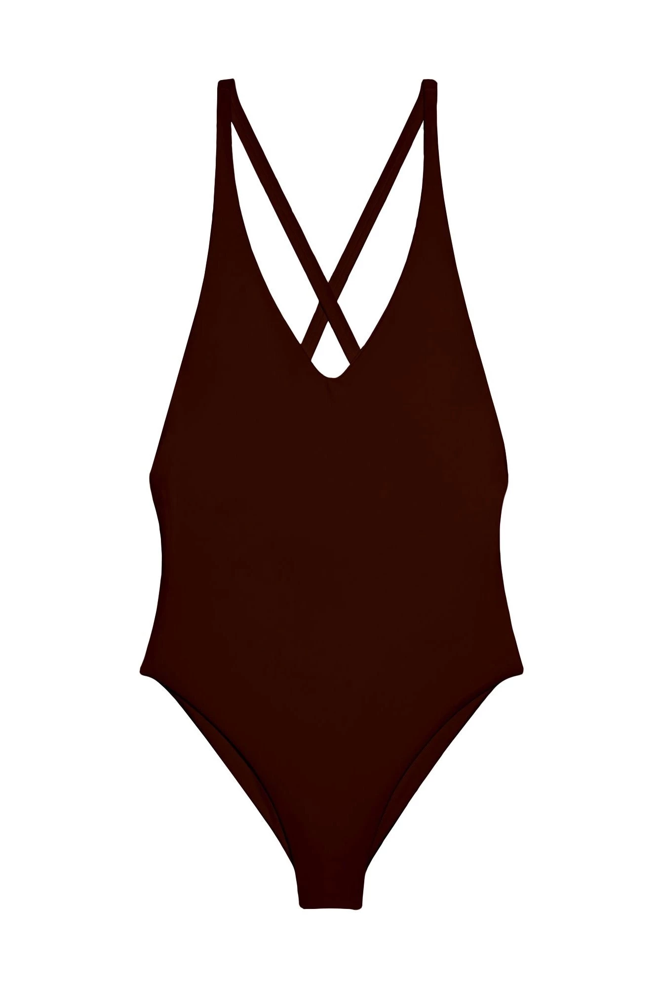 The Jade Swim Mila One Piece in Chocolate Sheen is a gorgeous deep V one piece with moderate coverage bottom coverage. The cross-back straps add beautiful detailing to a simple staple.Â