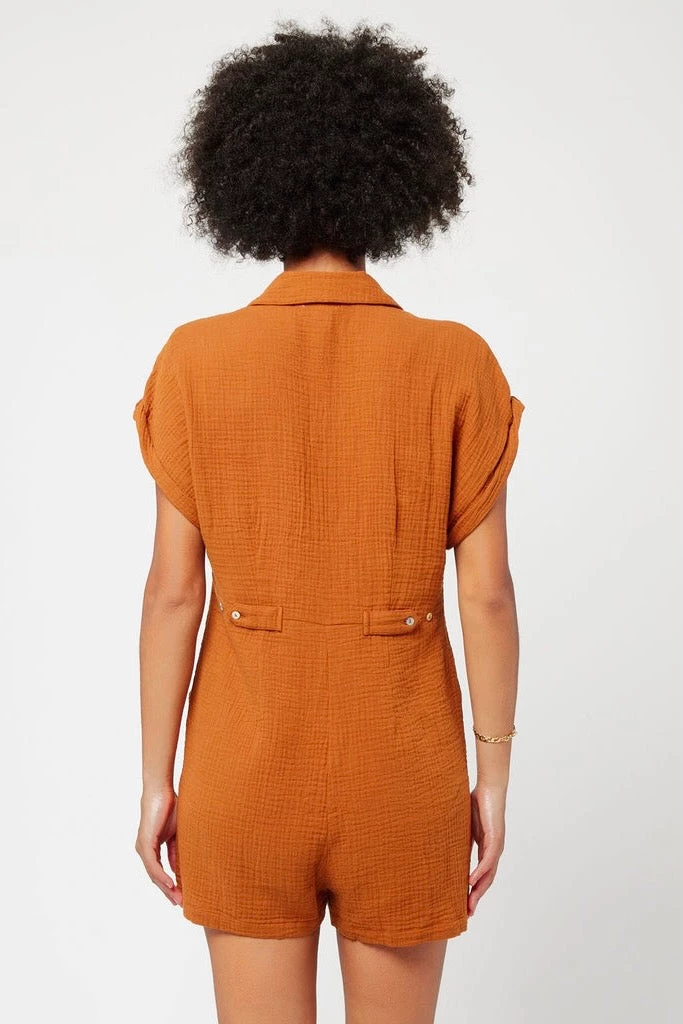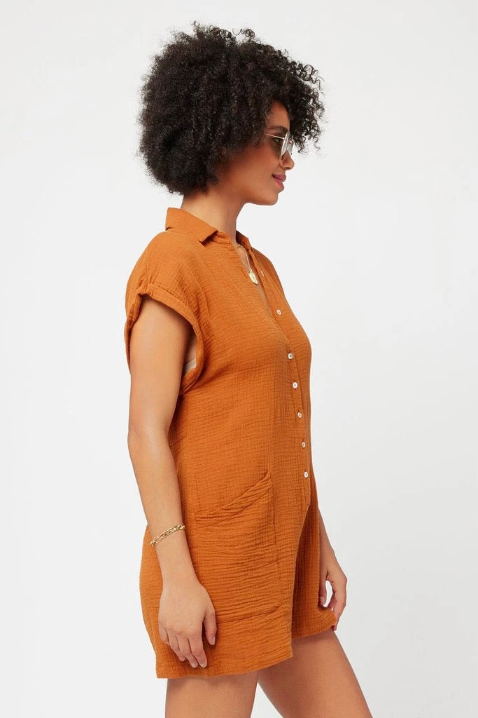 Play all day in the Mika Romper, a cute little shorts romper crafted from breezy fabric. Features a functional button down front with pockets and rolled hem sleeves.