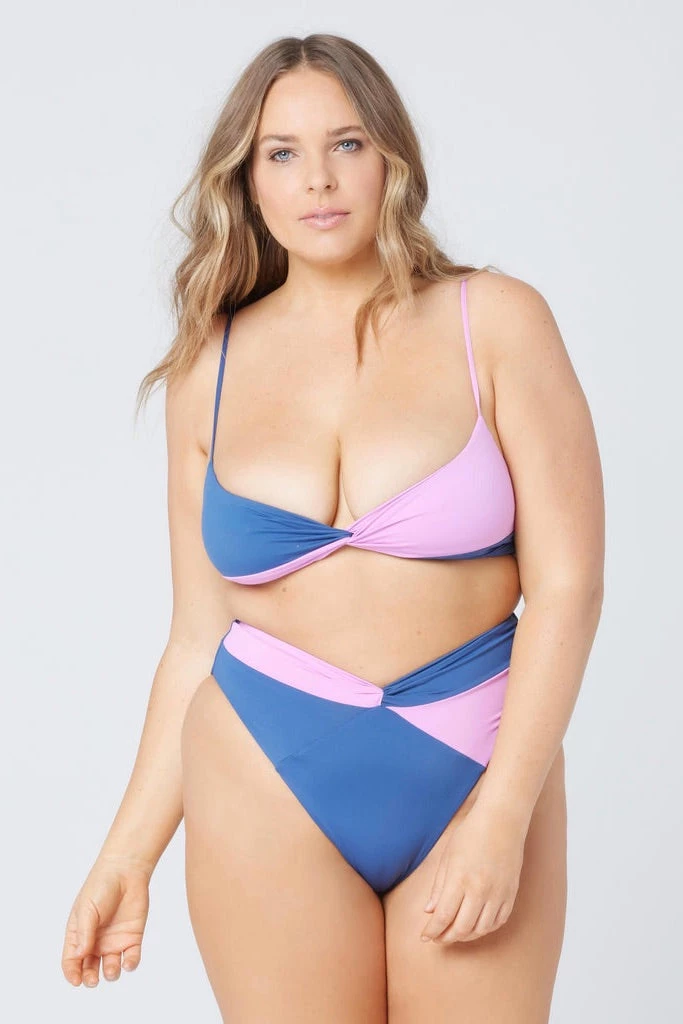 The Ringo is a vintage-inspired top with bold color blocking and a twist front detail. Features fully-adjustable back ties and straps.