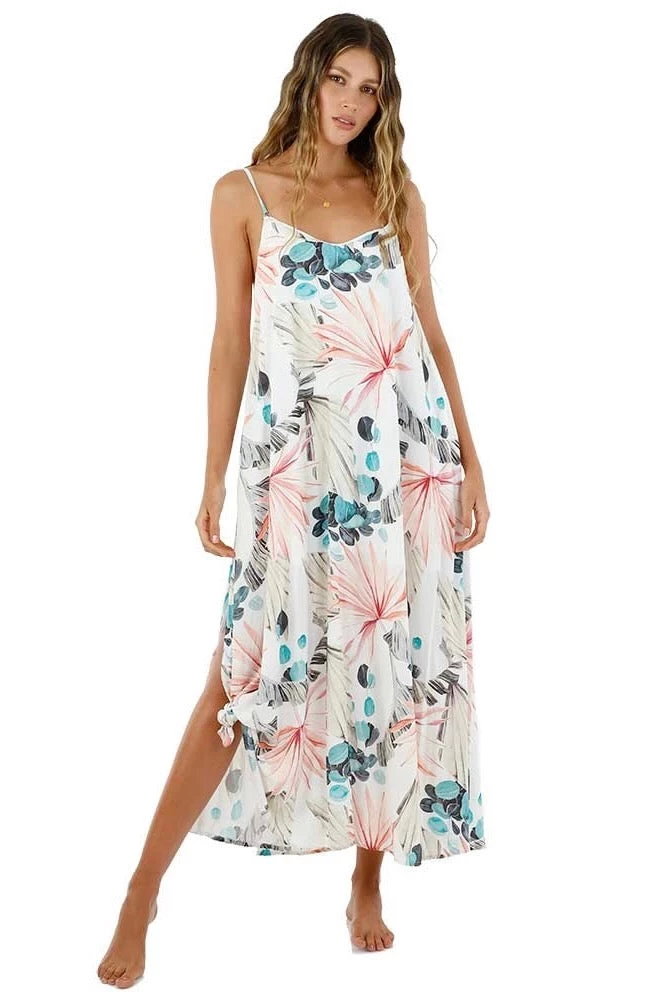 The Malai Opera Dress in White Mystery Palm is the perfect vacay dress! Featuring adjustable straps and a flowy cut with a moderate leg slit.Â