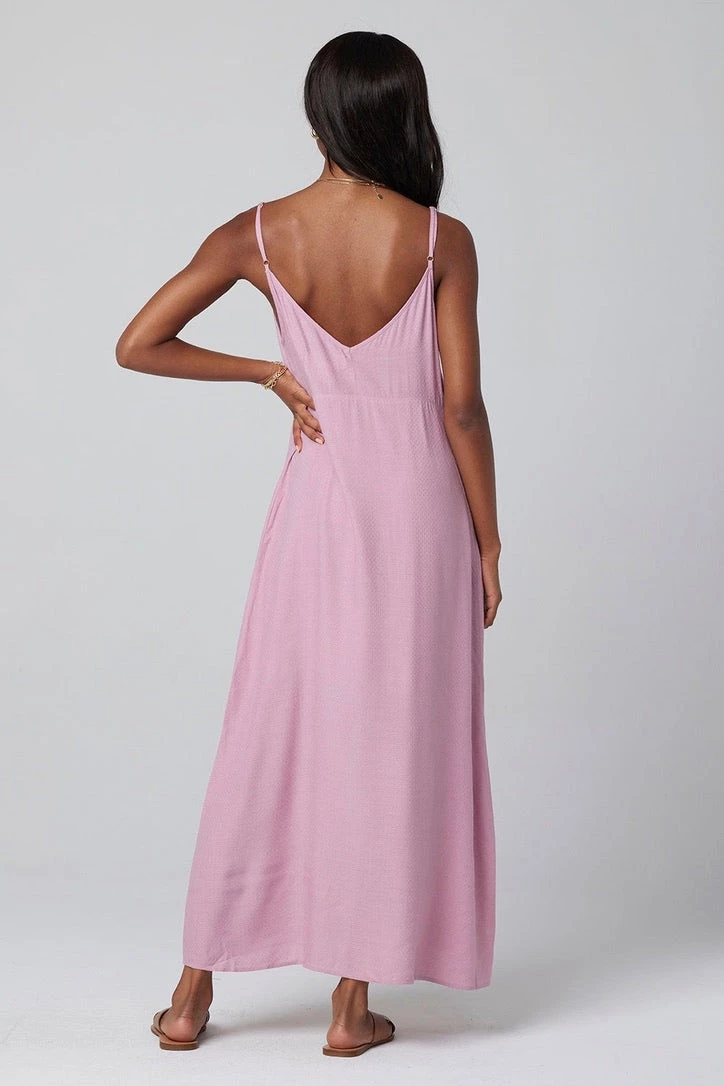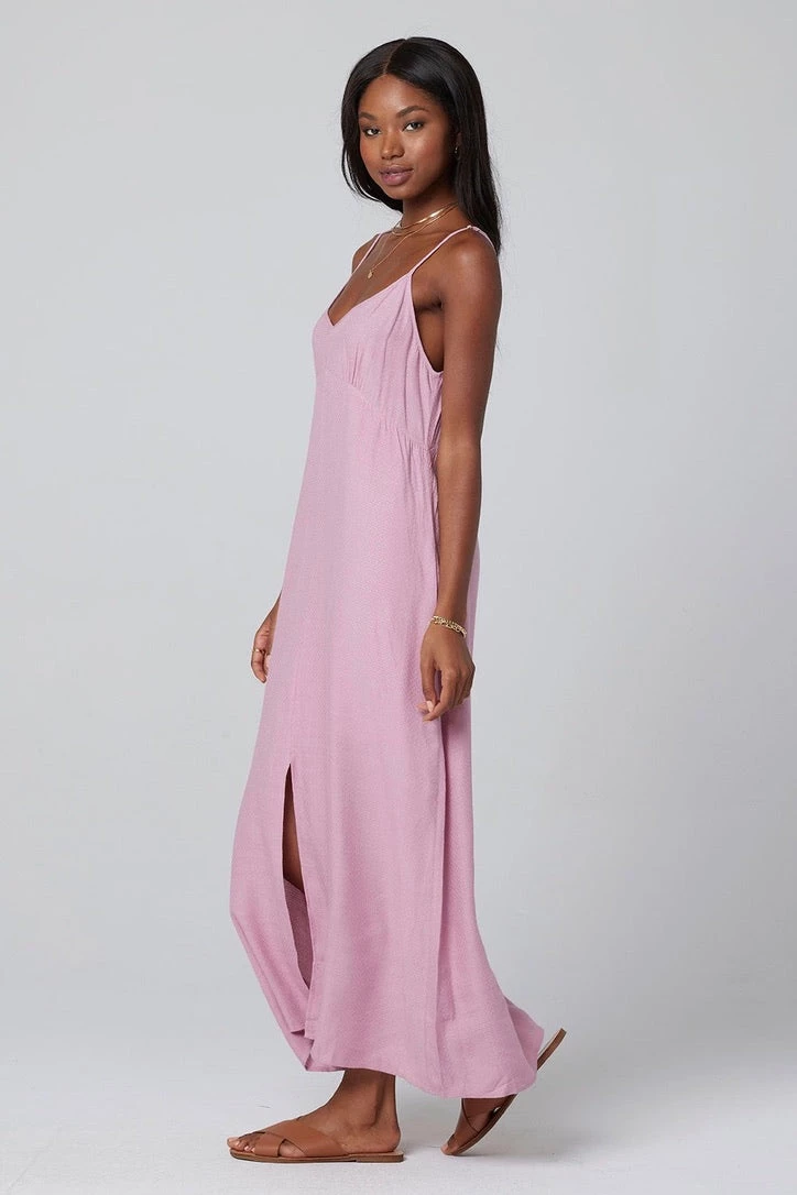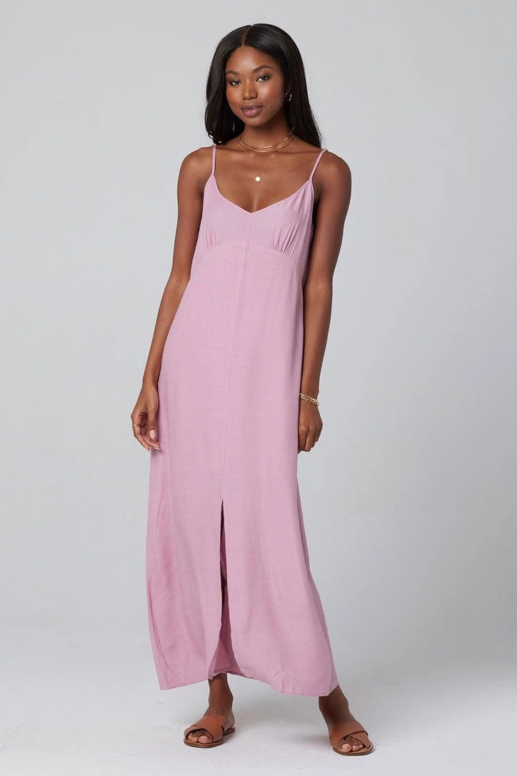 We found your solid-colored staple! Their 100% Rayon Sunrise Tank Maxi Dress features a floor-length lay, slit up the middle and spaghetti straps. Dress up or down with strappy sandals or sneakers!