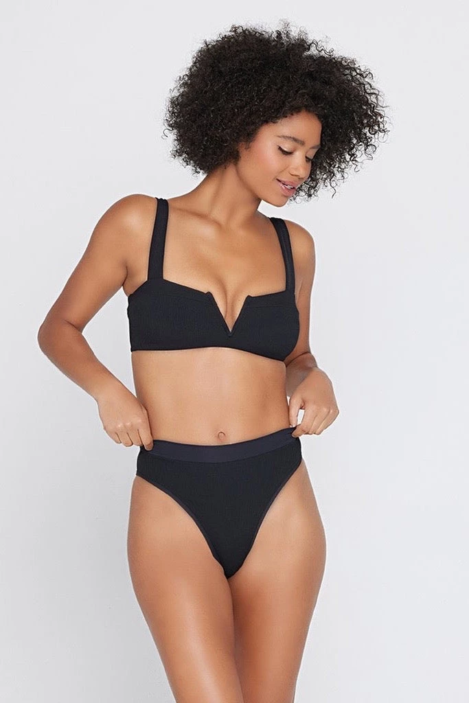 The Lee Lee features soft ribbed texture fabric and a sculptural silhouette. Offering comfy, moderate support. Lightly lined in our signature buttery fabric with wired V-neck detail at bust.Â